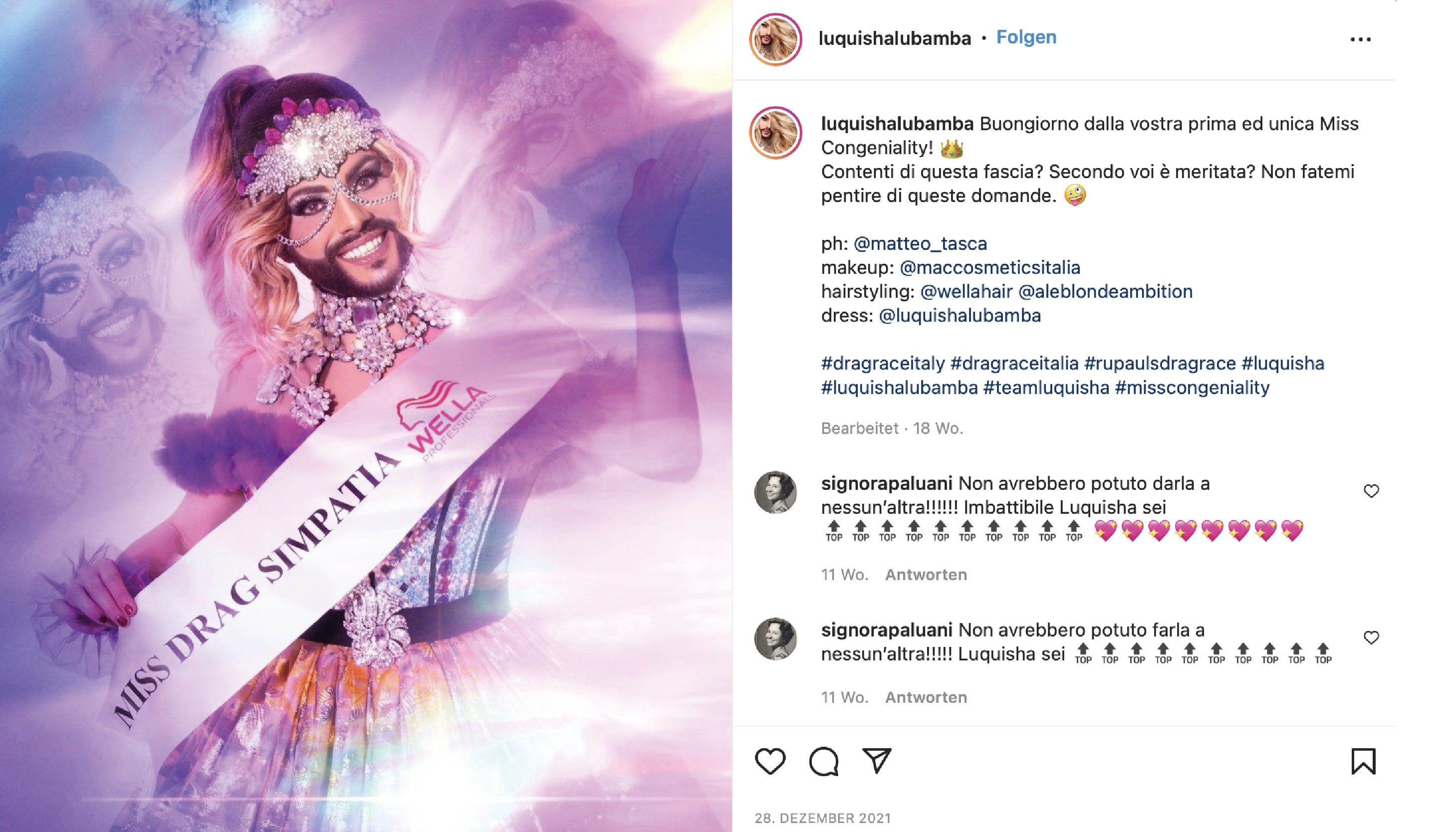 Luquisha Lubamba is a drag queen, singer and contestant in the first season of Drag Race Italia, a reality series where eight Italian drag queens compete for the title of being the first Italian drag superstar. Her real name is Luca Marchi. She may write on Instagram and Tik Tok “Non so fare niente ma sono brava a farlo.” (I can’t do anything, but I am good at it”) but her songs and music videos on Youtube suggest otherwise. She shares her styles, performances and insights into her private life on Instagram and TikTok as well as Twitter. With her confident appearance and fierce looks, Luquisha is not just a role model for many drag queens or those who want to become one, but everyone else, too.