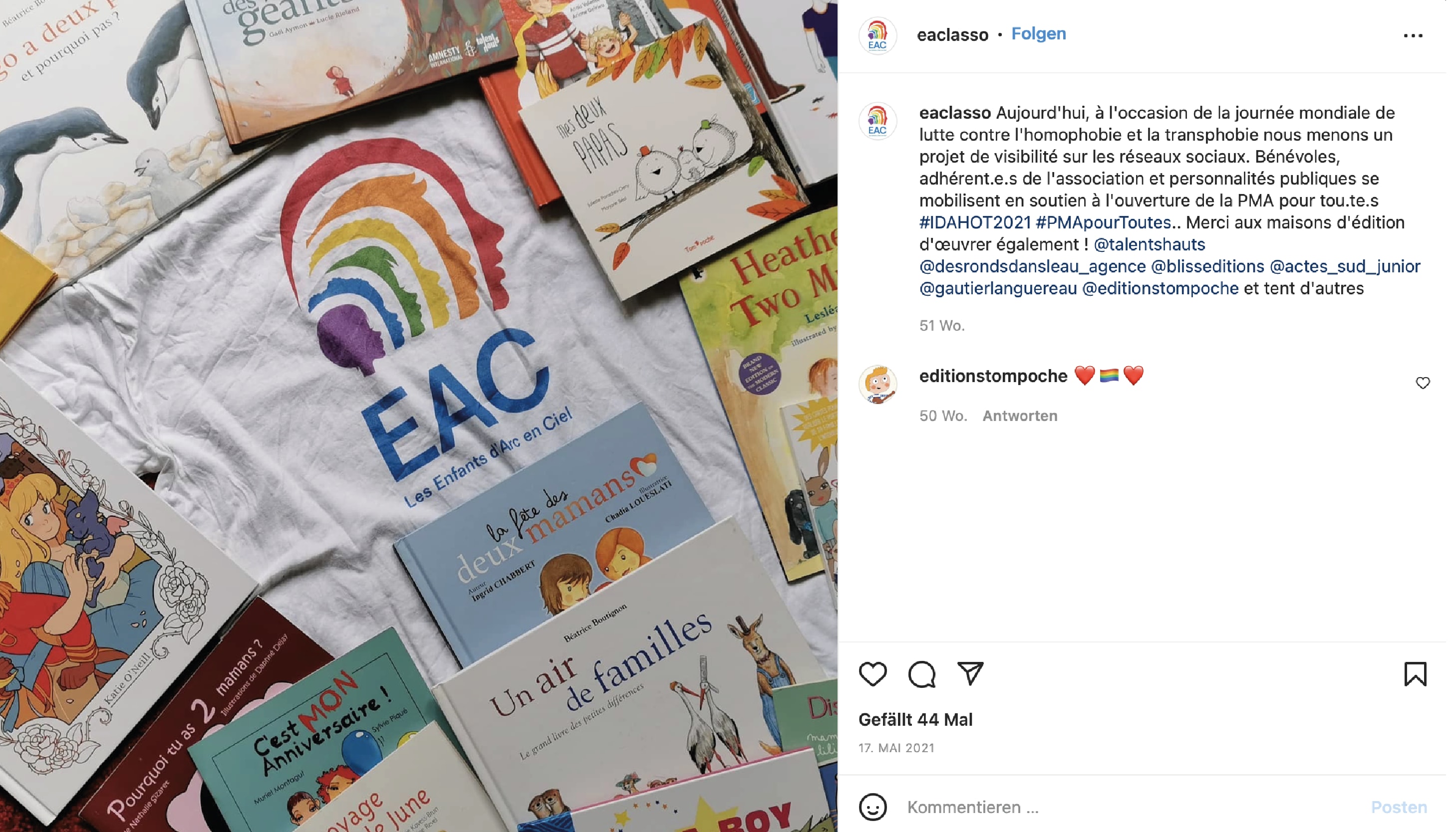 Les Enfants d’Arc en Ciel fights for the rights of homosexual parents. It is a non-profit organization from France that offers emotional and legal support to LGBTQI+ people before and during parenthood. They defend and promote queer families by making them visible, encouraging their right to exist and campaigning against discrimination. Les Enfants d’Arc en Ciel is at the forefront of the fight against all forms of queerphobia.