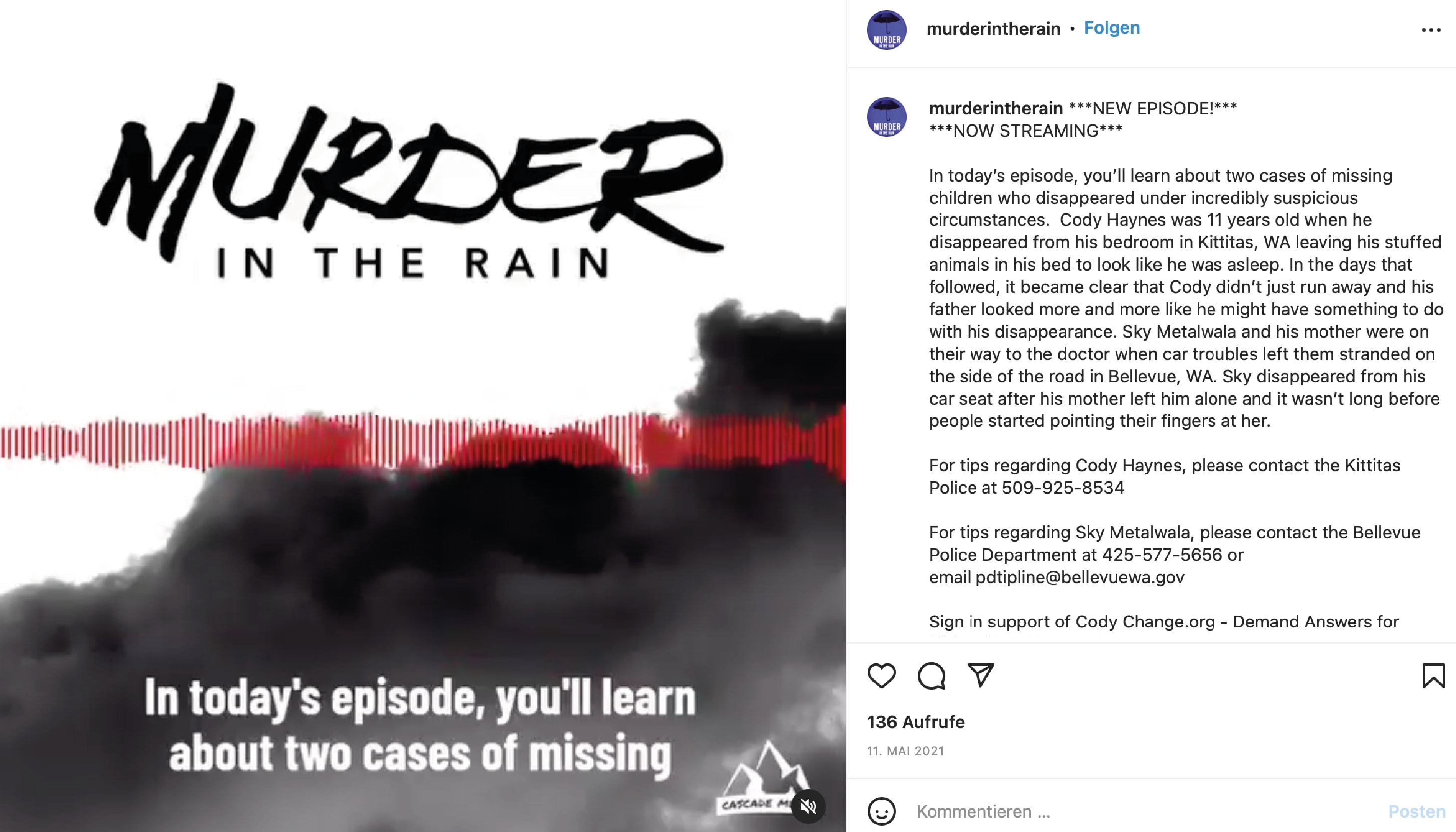 Emily and Alisha don’t just talk about real crimes, they explore, investigate and try to understand the motives behind the murder. In their podcast Murder in the Rain, the two talk to authors, psychologists, detectives, victims’ families, and their producer Josh. Who were the victims? What were the motives? On their Instagram, Facebook and Twitter pages you can find posts about true crime stories past and present.