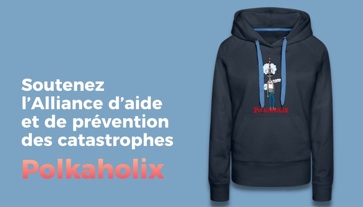 Polkaholix from Berlin are – what else – a polka band. In their Spreadshop, fans can find fun merch tees, hoodies, and more. But the band also uses their reach to donate to Action Alliance Disaster Relief (consisting of Caritas, Unicef, DRK and Diakonie). Their T-shirt design, “MAKE POLKA NOT WAR.” is featured in white lettering on all-dark clothing.