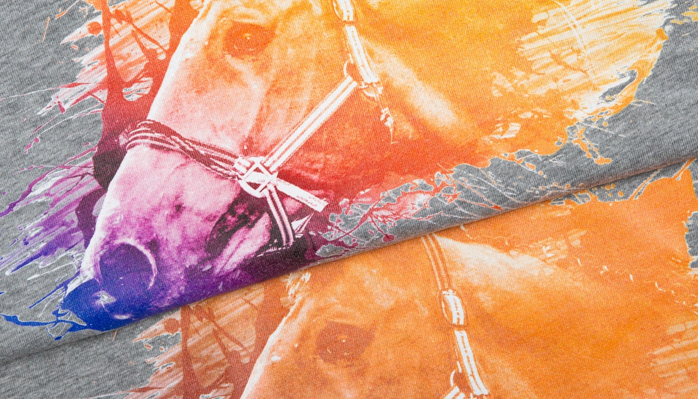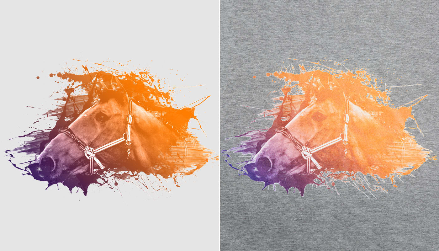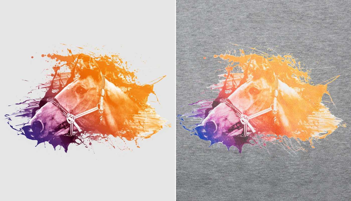 Dasselbe gilt für dieses Foto-Design. Fotografien haben in der Regel unendliche viele Details. Das Design sieht vor der Optimierung auf dem Bildschirm fantastisch aus. Der Druck jedoch hat einen stumpfen Farbverlauf und die Fülle an Texturen sowie Details ist verloren gegangen. Das wird besonders an Hals und Ohren des Pferdes deutlich. Nach der Optimierung treten diese Details viel stärker hervor, der Farbverlauf ist klarer und der Druck wirkt insgesamt detaillierter.