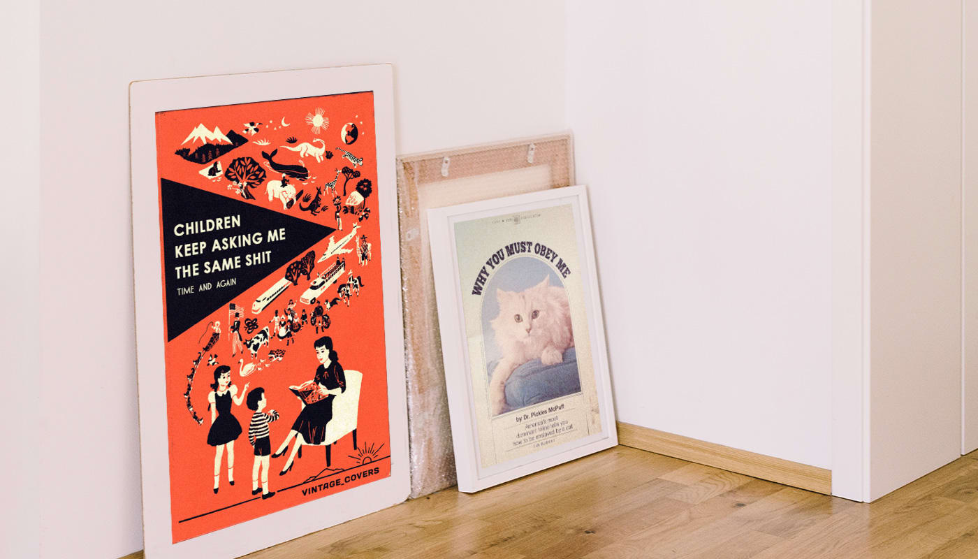 Angefangen hat alles mit Kinder fragen mich immer wieder den gleichen Scheiß. Das Buch heißt eigentlich ‘Questions Children Ask’. Bei dem Cover habe ich sofort daran gedacht, dass Kinder einen immer wieder mit denselben Fragen löchern. Ich hatte so viel Spaß damit, dass ich dachte, ich mache einfach mal ein paar mehr davon. Mittlerweile habe ich 239 Poster gestaltet. Tendenz steigend. Ich finde die Vorlagen an sehr unterschiedlichen Orten, aber der Großteil davon fällt mir in den Instagram-Posts diverser Buchläden ins Auge. Ich nenne das gerne mein #bookstagram.