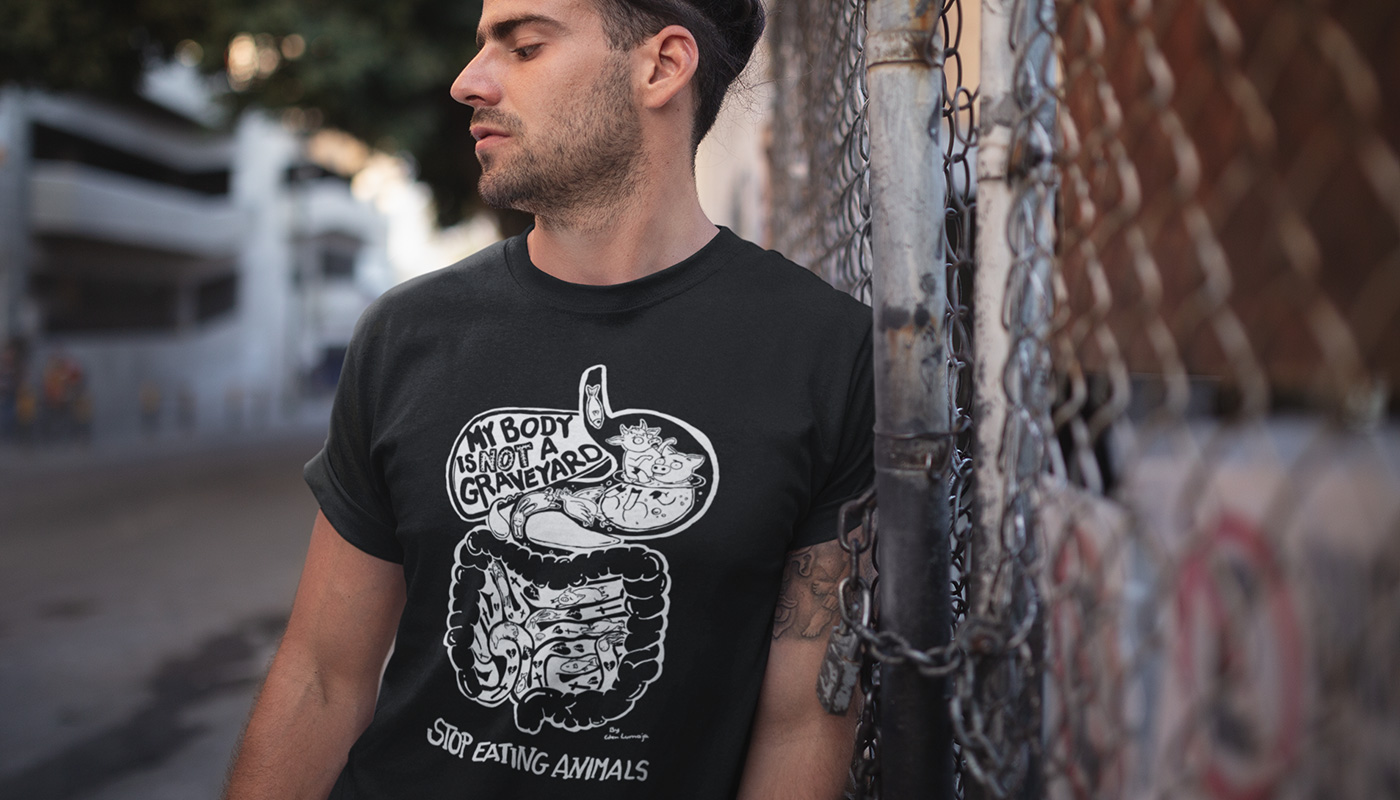 Mit meinen Zeichnungen versuche ich die Leute auf eine gefühlvolle und dennoch direkte Art aufzuklären. Beispielsweise habe ich eine Illustration, die ein süß gezeichnetes Schwein, dass geschlachtet werden soll, und den “Tod”, der es streichelt, zeigt. Dazu der Schriftzug: “Jährlich sterben Milliarden Tiere – Da bekommt selbst der Tod Mitleid!”. Sogar mir fällt dieser Anblick schwer. Aber das ist die Absicht dahinter: Meine Illustrationen sollen zum Nachdenken anregen.