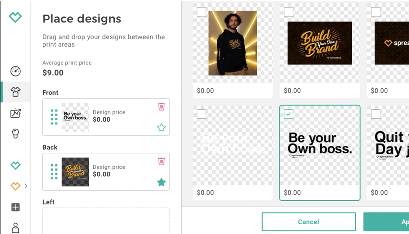 Wenn Du mehrere Designs auf einem Produkt platzierst, markierst Du in der Auswahl des Druckbereichs Dein Hauptdesign mithilfe des Sterns. Hast Du Dein Hauptdesign festgelegt, wird es sowohl in der Produkt- als auch in der Designansicht angezeigt. Du kannst die Designs innerhalb der verschiedenen Druckbereiche verschieben. Deine Einstellungen zum Standarddesign bleiben dabei bestehen.