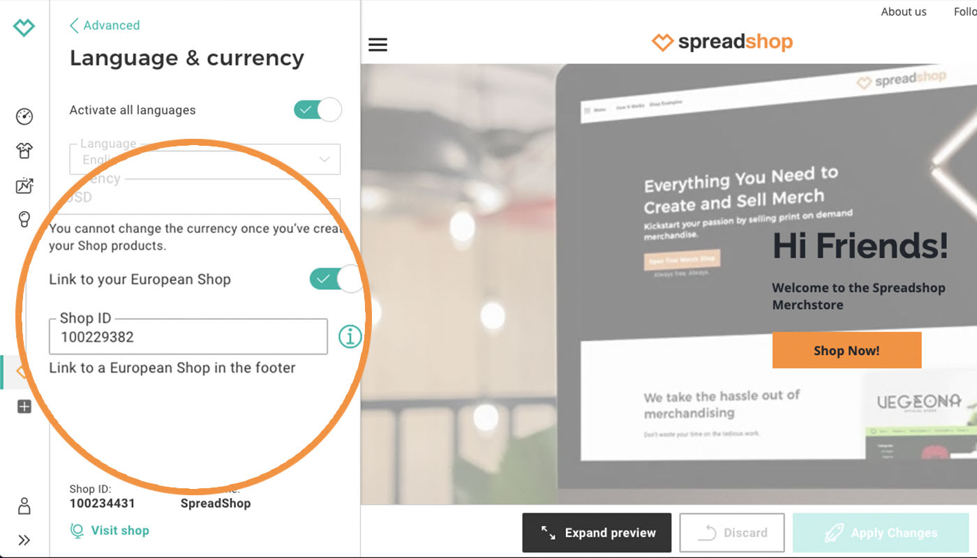 Falls du noch keinen Shop auf unserer nordamerikanischen Plattform eröffnet hast, musst Du das zuerst tun. Logge Dich in den Shop ein, den Du verlinken möchtest, und klick Dich durch: Shop bearbeiten > Erweitert > Sprache & Währung (Shop Settings > Advanced > Language & Currency). Dort aktivierst Du die Schaltfläche „Nordamerikanischen Shop verlinken“ bzw. „Europäischen Shop verlinken“.