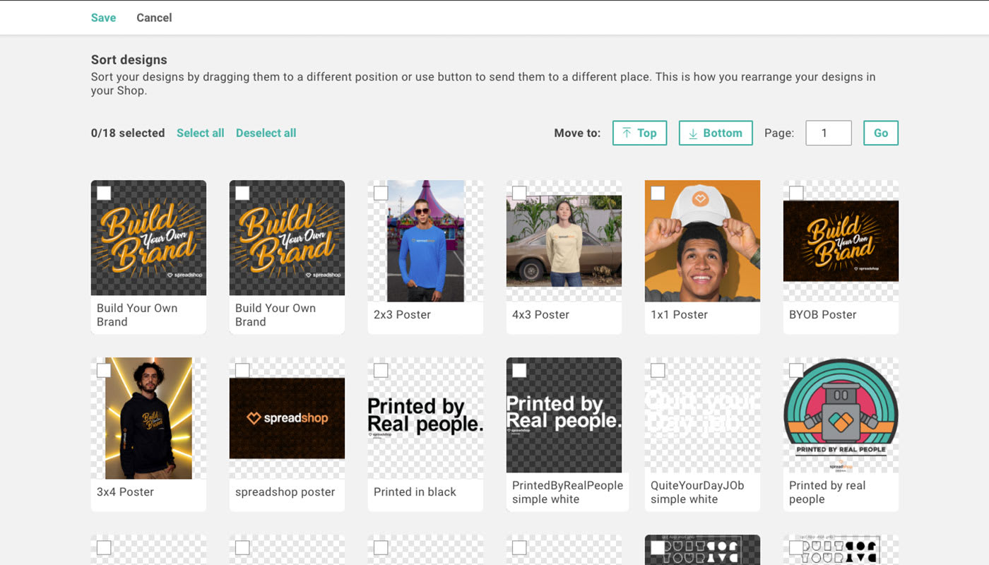 Wenn Du Designs nach dem Zeitpunkt des Uploads sortierst, kannst Du Deine neuesten Ideen automatisch als erstes (oder letztes) präsentieren. Kunden entdecken so immer wieder Neues beim Besuch in Deinem Shop. Obendrauf kannst Du bspw. noch ein paar Bestseller-Designs ganz oben anzeigen. Du musst sie nur auswählen und nach oben verschieben. Andere Designs kannst Du beliebig nach unten verschieben.