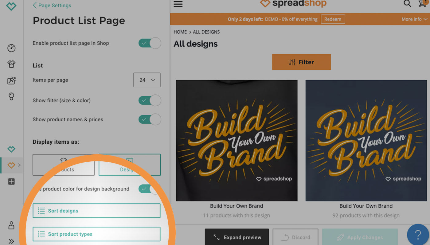 Auch für Deine Produkte gibt es eine Sortierfunktion. Zum Beispiel kannst Du einen Produkttypen ganz nach vorne verschieben. Achtung: Wenn Du einen Produkttyp nach vorne verschiebst, wird die Sortierung bei allen Designs mit diesem Produkttyp angewendet! Deine Produkte kannst Du leider nicht seitenweise (also per Pagination) verschieben.
