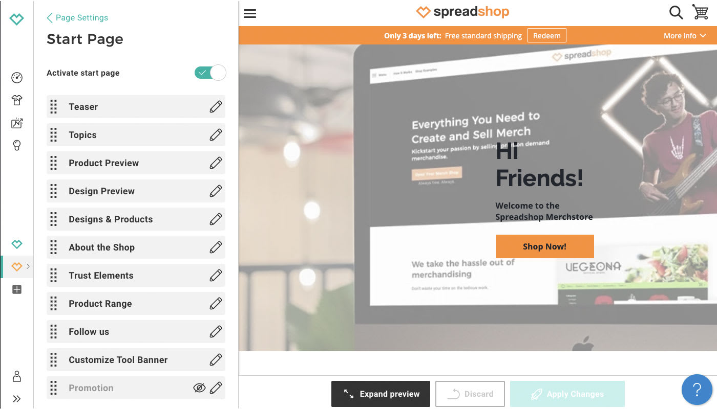 Du willst, dass Kunden Deinen Shop nicht gleich wieder verlassen? Dann aktiviere Deine Startseite! Zurzeit kannst Du 11 Elemente Deiner Startseite anpassen, verschieben und aktivieren bzw. deaktivieren. Ob Du mit der Produkt- und/oder Designvorschau Bestseller und Highlights in den Fokus stellst oder Deinem Shop mit Hilfe eines Teasers, einer Über uns-Seite, Follow-Buttons und Trust-Elementen mehr Persönlichkeit verleihst – die Startseite ist der Ort, an dem Du diese und mehr Elemente anordnen und gestalten kannst.