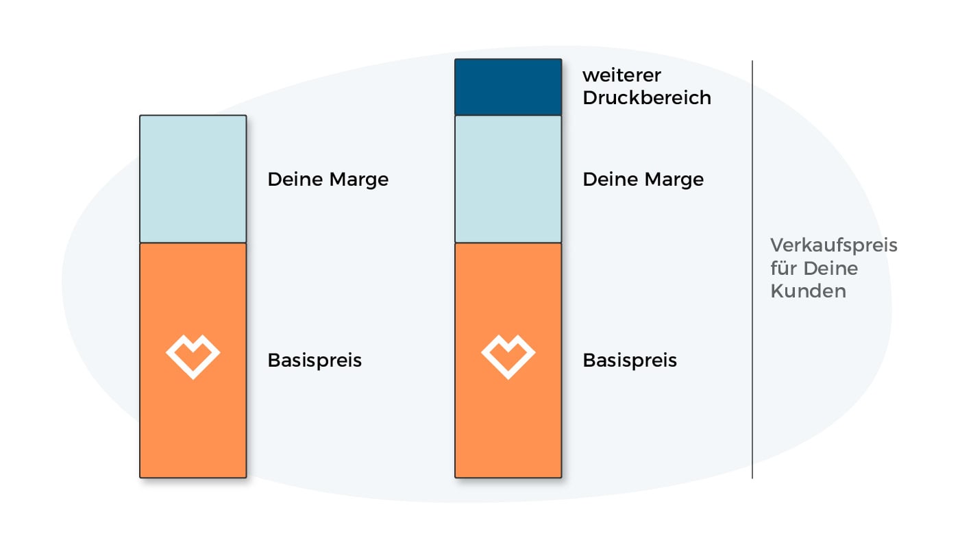 Im Basispreis sind bereits Druckkosten für einen Druckbereich enthalten. Wenn Du oder Deine Kunden weitere Druckbereiche anlegen, erhöht sich der Kundenpreis aktuell um jeweils 4,50 €. An Deiner Marge oder den Kosten für die Rabatte ändert sich dadurch nichts. Mit Einführung des neuen Vergütungsmodells wird es einfacher und günstiger, weitere Designs und Text auf einem Druckbereich zu platzieren. Wir rechnen immer nur die Zahl der genutzten Druckbereiche ab, nicht die Anzahl der Designs auf einem einzelnen Druckbereich.