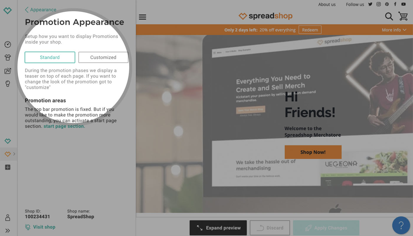 Der normale Rabatt wird bei laufenden Aktionen auf all Deinen Shop-Seiten angezeigt. Also nicht nur auf der Startseite, sondern auch in der Produkt- oder Design-Ansicht. Den Look des Banners kannst Du in Deinen Shop-Einstellungen unter Aussehen > Rabatt-Banner an den Stil Deines Shops anpassen. Dort änderst Du den Hintergrund und die Textfarbe des Banners. Für das Hintergrundbild kannst Du ein eigene Grafik hochladen oder Dich in unserer Galerie bedienen.