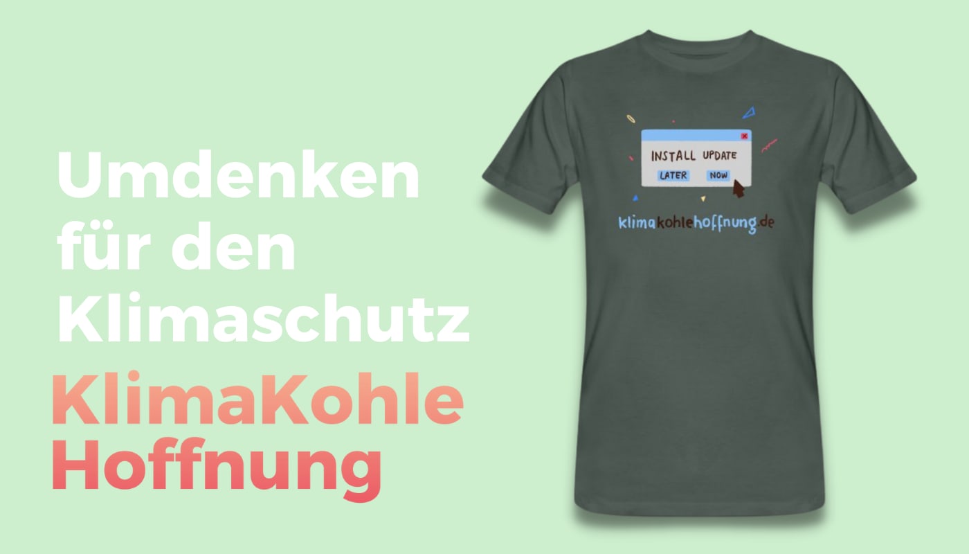 Mit dem KlimaKohleHoffnung Spreadshop geht der Fachverband einen wichtigen Weg, um genau das zu erreichen. Ihre Designs haben eine klare Botschaft: Es gibt noch Hoffnung, aber wir haben keine Zeit zu verlieren. Beim Install-Update-Design zeigt die Maus deshalb auf den Button „Now“ – und nicht auf den Button „Later“.
