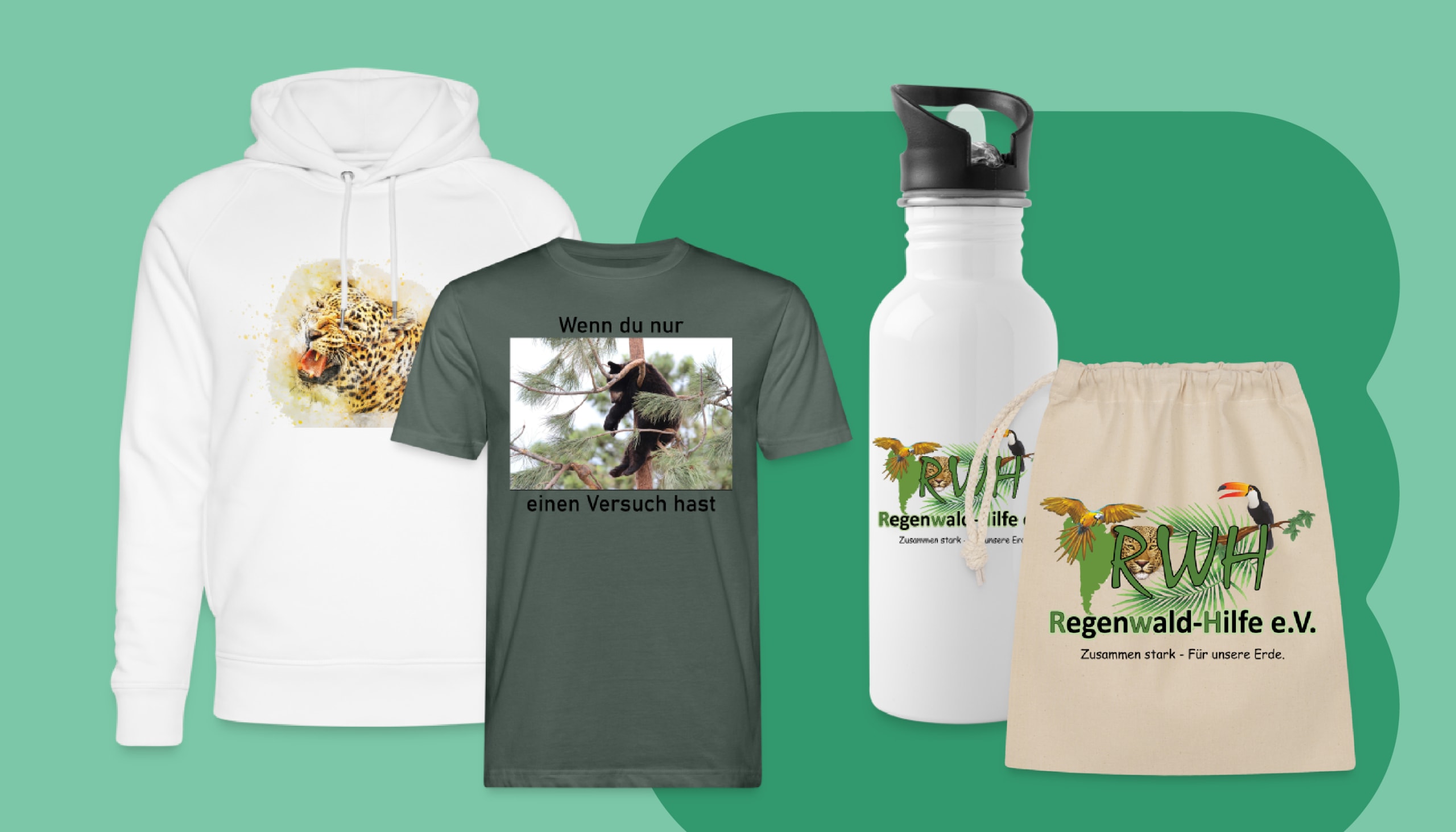 „Unseren Merch bieten wir mit unserem Vereinslogo und anderen Designs an. Durch die Kooperation mit Spreadshop erhalten wir für jeden Verkauf einen Teil des Preises als Spende für unsere Vereinsarbeit. Die angebotenen Textilien bestehen darüber hinaus aus Materialien nach Bio-Standard für ökologischen Anbau.“ – Regenwald-Hilfe e.V.