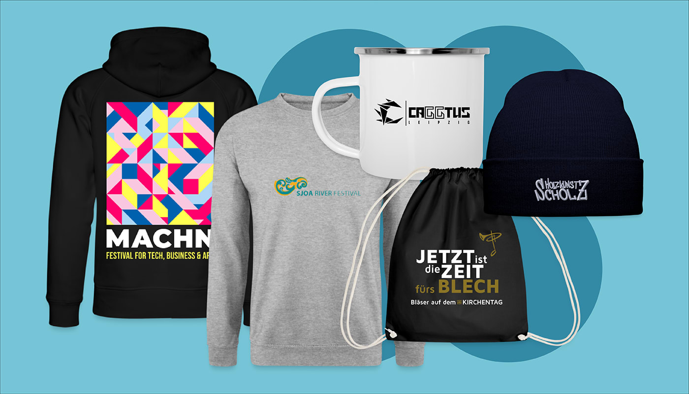 - Tragbare Werbegeschenke: T-Shirts, Mützen und Hoodies eignen sich perfekt, um die Besucher*innen Deiner Veranstaltung zu wandelnden Markenbotschafter*innen zu machen.