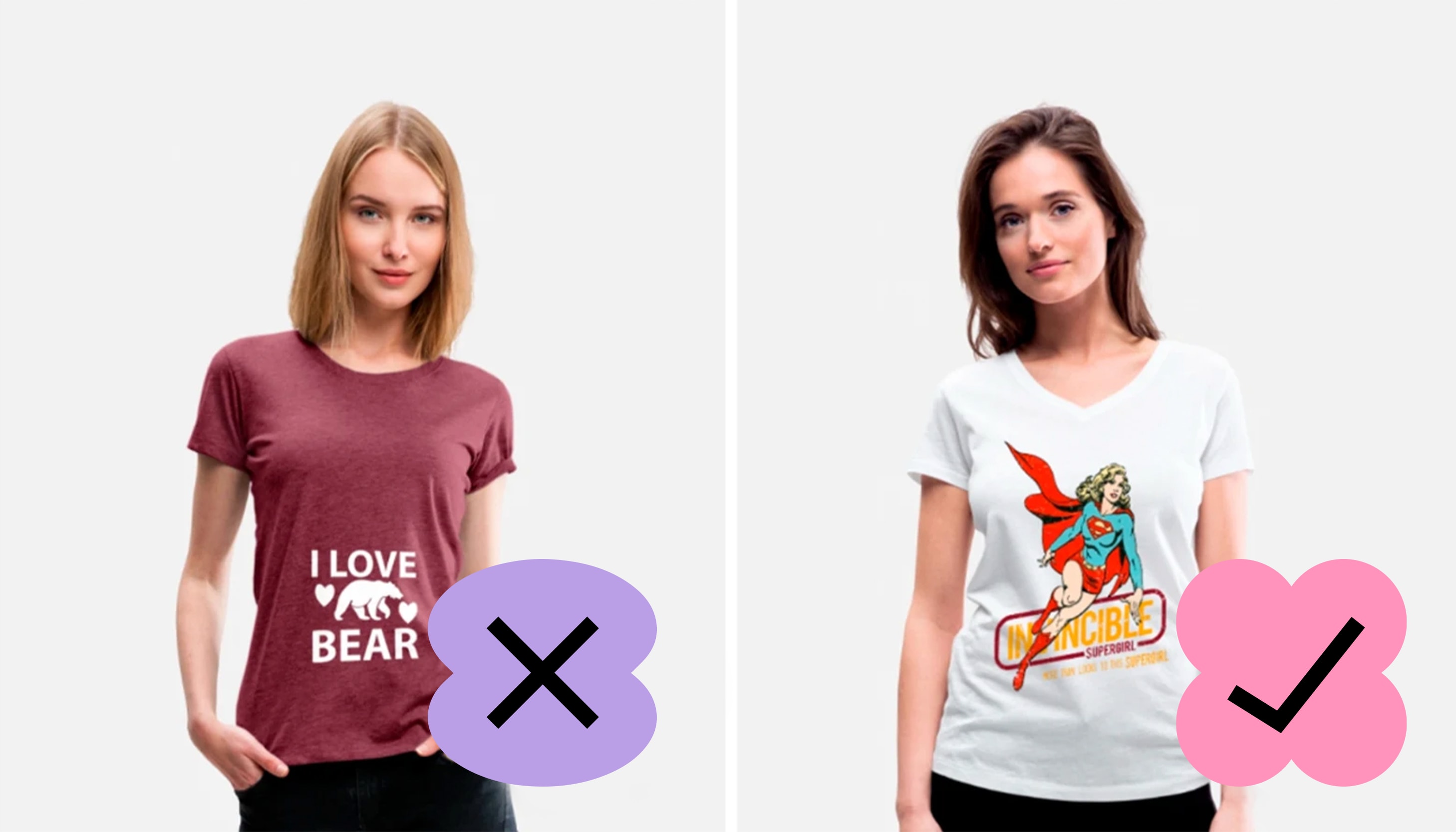 - Betrachte dein Design und das Produkt als Ganzes! Denke zum Beispiel an die verschiedenen Produktfarben und die verschiedenen Druckbereiche – oder auch an verschiedene Körperformen und -größen.