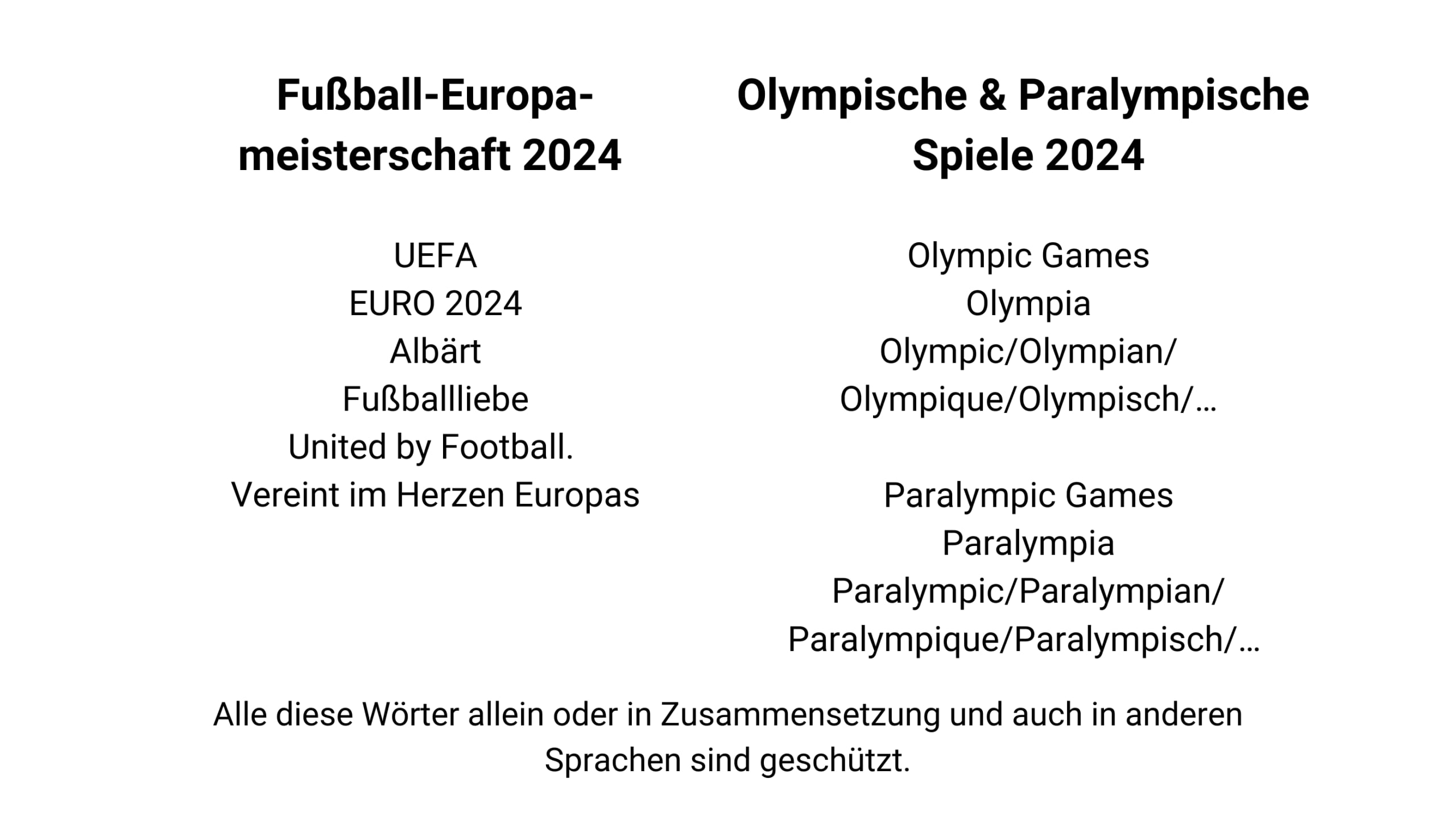 Doch nicht nur die offiziellen UEFA- und Olympia-/Paralympics-Logos, Maskottchen und Begriffe sind verboten. Auch bei Partnern, Sponsoren und weiteren Marken, die mit den Sportereignissen in Verbindung stehen, solltest Du vorsichtig sein.