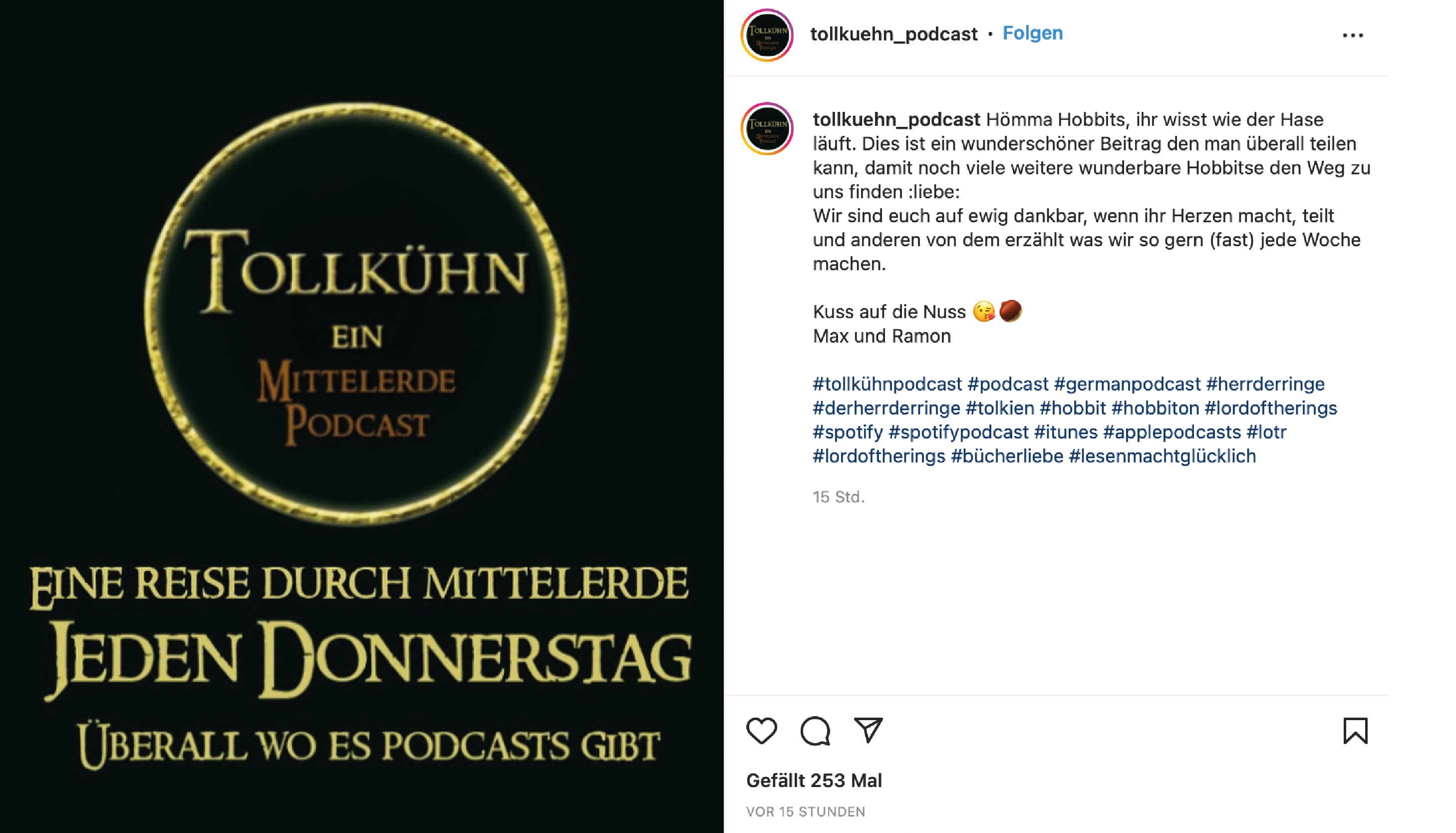 Jeden Donnerstag ist tollkühner Podcast-Tag: Der Mittelerde-Podcast nimmt die Hörenden mit in die fantastische Welt des Fantasy-Romans „Der Herr der Ringe“. In jeder Podcast-Folge lesen Max und Ramon ein Kapitel aus den Büchern und teilen ihre Gedanken dazu. Max ist Fan und hat das Buch schon mehrmals gelesen, Ramon ist Neuling. Gefährliches Halbwissen trifft also auf fundiertes Wissen über Mittelerde. Herr-der-Ringe-Fans finden die zwei auch bei Facebook, Instagram und Twitter.