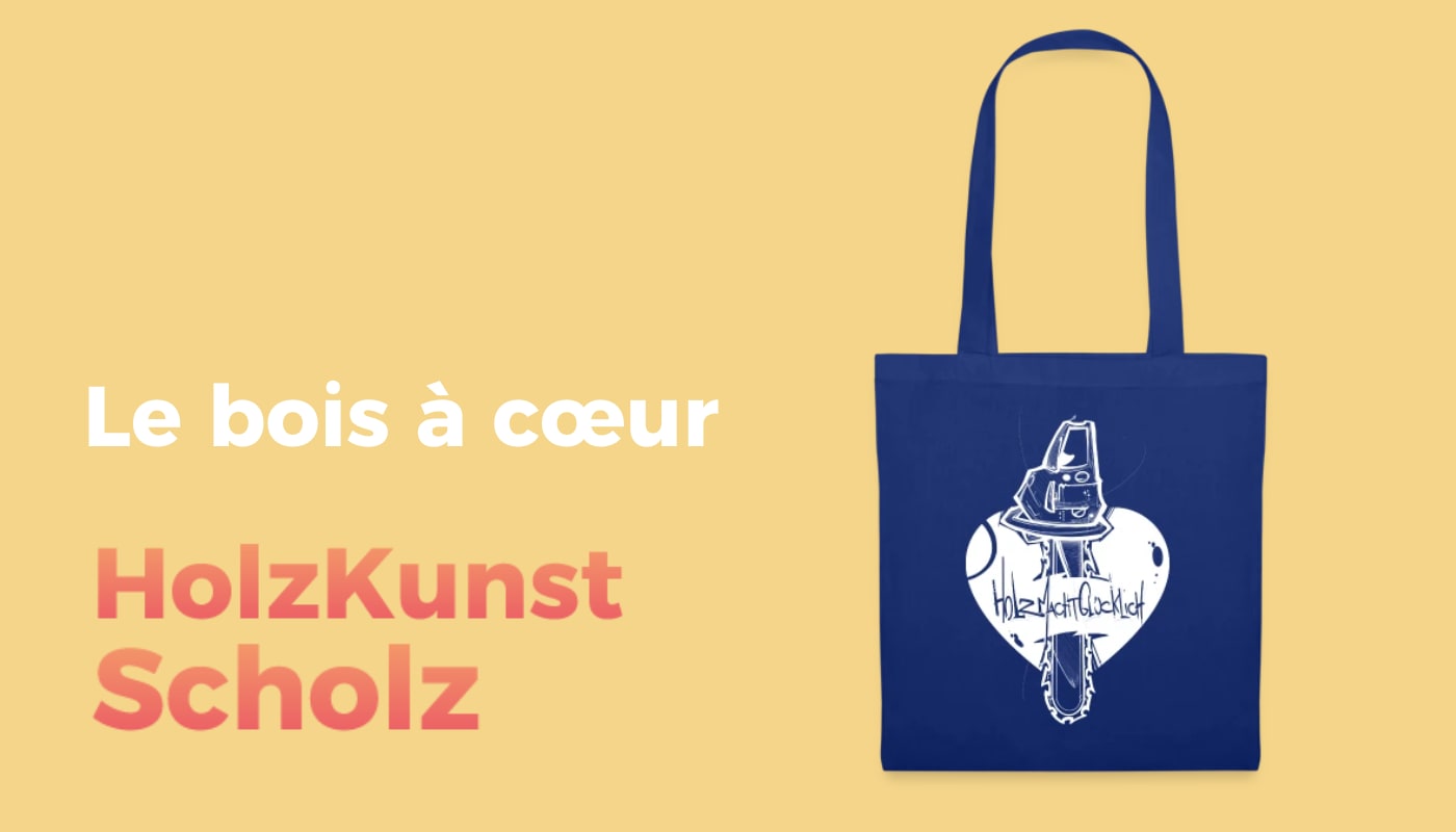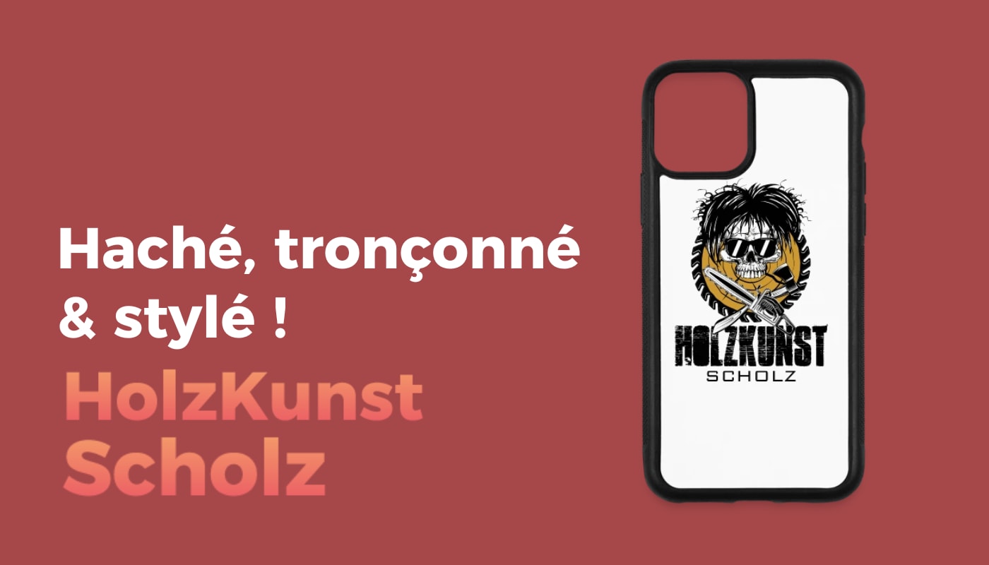 Dans le Spreadshop de Holzkunst Scholz, le bois est au centre de l’attention ainsi que les outils qu’il utilisent. On aime par exemple ce tote bag bleu foncé avec l’inscription « Holz macht glücklich » (trd. « Le bois rend heureux ») dans un cœur blanc transpercé d’une tronçonneuse. Ou encore cette coque de téléphone blanche pour le moins déjantée.