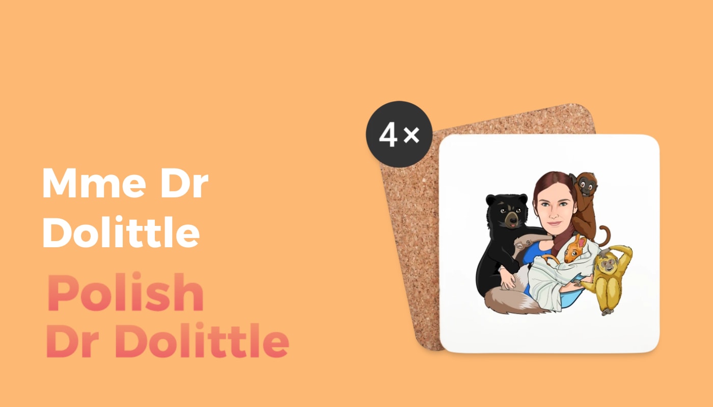 Dans le Spreadshop de Polish Dr Dolittle, vous trouverez des animaux, évidemment. Elle qui rend hommage aux animaux, nous lui rendons hommage à notre tour en présentant ce lot de quatre dessous de verre. On y voit Gosia entourée d’animaux dans un beau moment de complicité, telle une photo de famille.